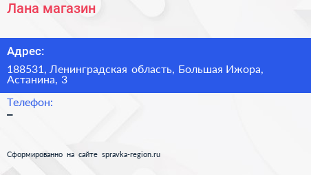 Лана, магазин по адресу 188531, Ленинградская область, Большая Ижора, Астанина, 3 в дальнейшем Организация, размещена в следующих категориях: