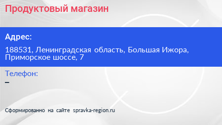 Продуктовый магазин по адресу 188531, Ленинградская область, Большая Ижора, Приморское шоссе, 7 в дальнейшем Организация, размещена в следующих категориях: