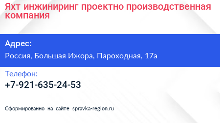 Для связи с организацией воспользуйтесь номером телефона: +7-921-635-24-53. Пн: c 09:00-17:00, Вт: c 09:00-17:00, Ср: c 09:00-17:00, Чт: c 09:00-17:00, Пт: c 09:00-17:00, Сб: выходной, Вс: выходной, вы можете обратиться в эту организацию.