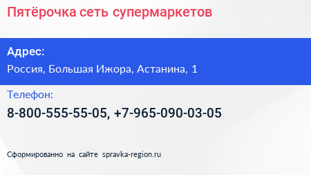Пятёрочка, сеть супермаркетов по адресу Сбербанк, 1, улица Астанина, Большеижорское городское поселение, Ломоносовский район, Ленинградская область, Северо-Западный федеральный округ, 188531, Россия в дальнейшем Организация, размещена в следующих категориях: