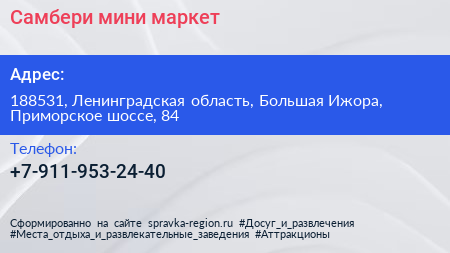 Самбери, мини-маркет по адресу 188531, Ленинградская область, Большая Ижора, Приморское шоссе, 84 в дальнейшем Организация, размещена в следующих категориях: