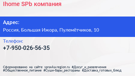 Ihome. SPb, компания по адресу Общежитие Бегуницкого техникума, 10, улица Пулемётчиков, Кронштадтская колония, Ломоносов, Санкт-Петербург, Северо-Западный федеральный округ, 198412, Россия в дальнейшем Организация, размещена в следующих категориях: