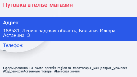 Пуговка, ателье-магазин по адресу 188531, Ленинградская область, Большая Ижора, Астанина, 3 в дальнейшем Организация, размещена в следующих категориях: