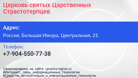 Церковь святых Царственных Страстотерпцев по адресу 21Д, Центральная улица, Малая Ижора, Пеники, Пениковское сельское поселение, Ломоносовский район, Ленинградская область, Северо-Западный федеральный округ, 188530, Россия в дальнейшем Организация, размещена в следующих категориях: