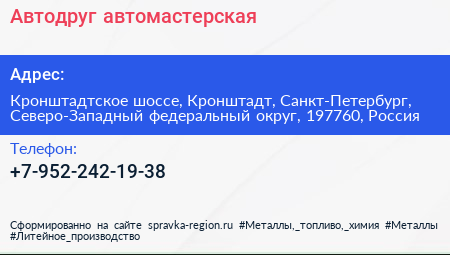 Автодруг, автомастерская по адресу Кронштадтское шоссе, Кронштадт, Санкт-Петербург, Северо-Западный федеральный округ, 197760, Россия в дальнейшем Организация, размещена в следующих категориях: