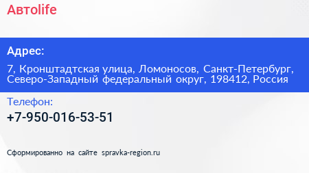 Автоlife по адресу 7, Кронштадтская улица, Ломоносов, Санкт-Петербург, Северо-Западный федеральный округ, 198412, Россия в дальнейшем Организация, размещена в следующих категориях: