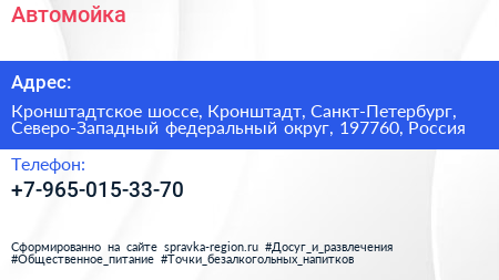 Автомойка по адресу Кронштадтское шоссе, Кронштадт, Санкт-Петербург, Северо-Западный федеральный округ, 197760, Россия в дальнейшем Организация, размещена в следующих категориях: