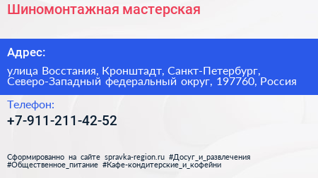 Шиномонтажная мастерская по адресу улица Восстания, Кронштадт, Санкт-Петербург, Северо-Западный федеральный округ, 197760, Россия в дальнейшем Организация, размещена в следующих категориях: