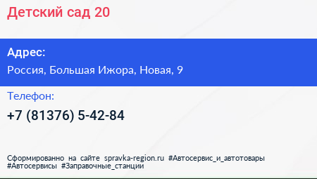 Детский сад №20 по адресу Детский сад № 20, Новая улица, Пеники, Пениковское сельское поселение, Ломоносовский район, Ленинградская область, Северо-Западный федеральный округ, 188530, Россия в дальнейшем Организация, размещена в следующих категориях: