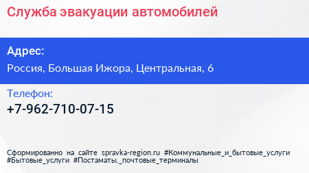 Служба эвакуации автомобилей по адресу 6, Центральная улица, Малая Ижора, Пеники, Пениковское сельское поселение, Ломоносовский район, Ленинградская область, Северо-Западный федеральный округ, 188530, Россия в дальнейшем Организация, размещена в следующих категориях: