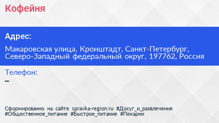 Кофейня по адресу Макаровская улица, Кронштадт, Санкт-Петербург, Северо-Западный федеральный округ, 197762, Россия в дальнейшем Организация, размещена в следующих категориях: