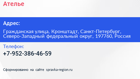 Ателье по адресу Гражданская улица, Кронштадт, Санкт-Петербург, Северо-Западный федеральный округ, 197760, Россия в дальнейшем Организация, размещена в следующих категориях: