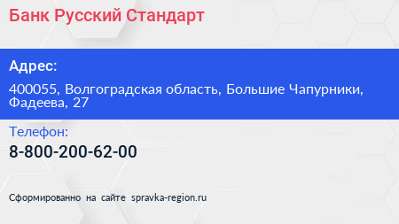 Банк Русский Стандарт по адресу 400055, Волгоградская область, Большие Чапурники, Фадеева, 27 в дальнейшем Организация, размещена в следующих категориях: