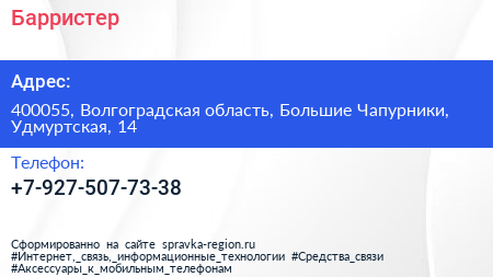 Барристер по адресу 400055, Волгоградская область, Большие Чапурники, Удмуртская, 14 в дальнейшем Организация, размещена в следующих категориях: