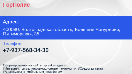 ГорПолис по адресу 400080, Волгоградская область, Большие Чапурники, Пятиморская, 35 в дальнейшем Организация, размещена в следующих категориях: