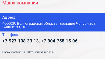 М-два, компания по адресу 400029, Волгоградская область, Большие Чапурники, Вилянская, 18 в дальнейшем Организация, размещена в следующих категориях: