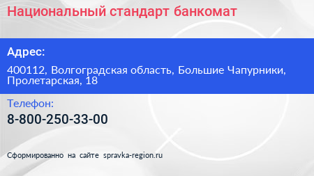 Национальный стандарт, банкомат по адресу 400112, Волгоградская область, Большие Чапурники, Пролетарская, 18 в дальнейшем Организация, размещена в следующих категориях: