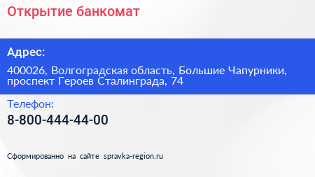 Открытие, банкомат по адресу 400026, Волгоградская область, Большие Чапурники, проспект Героев Сталинграда, 74 в дальнейшем Организация, размещена в следующих категориях: