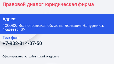 Правовой диалог, юридическая фирма по адресу 400082, Волгоградская область, Большие Чапурники, Фадеева, 39 в дальнейшем Организация, размещена в следующих категориях: