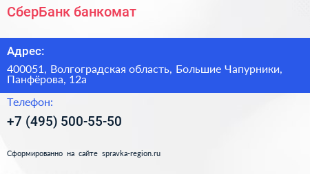 СберБанк, банкомат по адресу 400051, Волгоградская область, Большие Чапурники, Панфёрова, 12а в дальнейшем Организация, размещена в следующих категориях: