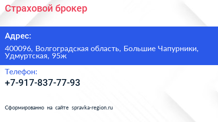 Страховой брокер по адресу 400096, Волгоградская область, Большие Чапурники, Удмуртская, 95ж в дальнейшем Организация, размещена в следующих категориях: