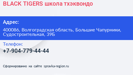 BLACK TIGERS, школа тхэквондо по адресу 400086, Волгоградская область, Большие Чапурники, Судостроительная, 39Б в дальнейшем Организация, размещена в следующих категориях: