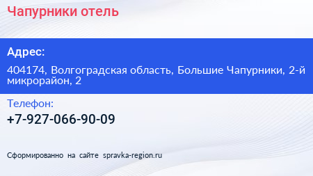 Чапурники, отель по адресу 404174, Волгоградская область, Большие Чапурники, 2-й микрорайон, 2 в дальнейшем Организация, размещена в следующих категориях: