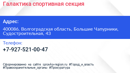 Галактика, спортивная секция по адресу 400086, Волгоградская область, Большие Чапурники, Судостроительная, 43 в дальнейшем Организация, размещена в следующих категориях: