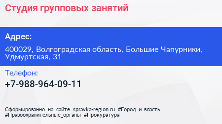 Студия групповых занятий по адресу 400029, Волгоградская область, Большие Чапурники, Удмуртская, 31 в дальнейшем Организация, размещена в следующих категориях: