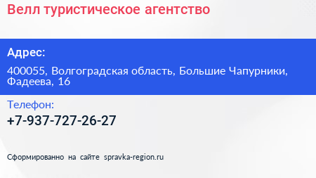 Велл, туристическое агентство по адресу 400055, Волгоградская область, Большие Чапурники, Фадеева, 16 в дальнейшем Организация, размещена в следующих категориях: