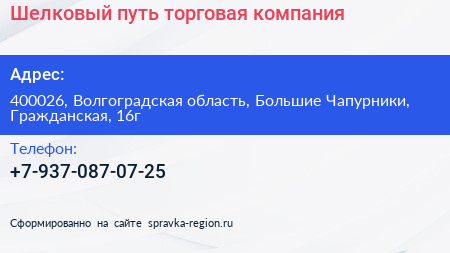 Шелковый путь, торговая компания по адресу 400026, Волгоградская область, Большие Чапурники, Гражданская, 16г в дальнейшем Организация, размещена в следующих категориях: