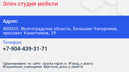 Элен, студия мебели по адресу 400055, Волгоградская область, Большие Чапурники, проспект Канатчиков, 19 в дальнейшем Организация, размещена в следующих категориях: