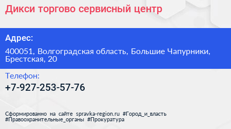 Дикси, торгово-сервисный центр по адресу 400051, Волгоградская область, Большие Чапурники, Брестская, 20 в дальнейшем Организация, размещена в следующих категориях: