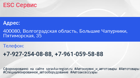 ESC Сервис по адресу 400080, Волгоградская область, Большие Чапурники, Пятиморская, 35 в дальнейшем Организация, размещена в следующих категориях: