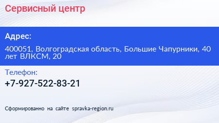 Сервисный центр по адресу 400051, Волгоградская область, Большие Чапурники, 40 лет ВЛКСМ, 20 в дальнейшем Организация, размещена в следующих категориях: