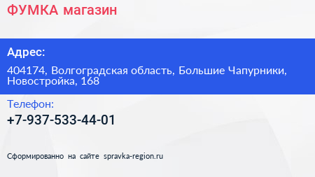 ФУМКА, магазин по адресу 404174, Волгоградская область, Большие Чапурники, Новостройка, 168 в дальнейшем Организация, размещена в следующих категориях: