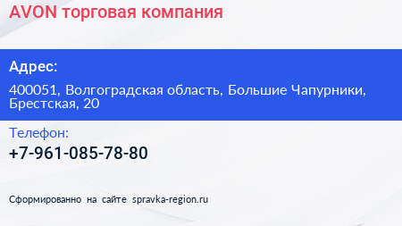 AVON, торговая компания по адресу 400051, Волгоградская область, Большие Чапурники, Брестская, 20 в дальнейшем Организация, размещена в следующих категориях: