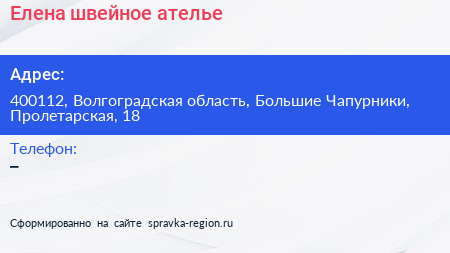 Елена, швейное ателье по адресу 400112, Волгоградская область, Большие Чапурники, Пролетарская, 18 в дальнейшем Организация, размещена в следующих категориях: