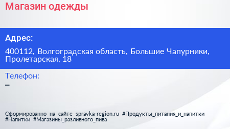 Магазин одежды по адресу 400112, Волгоградская область, Большие Чапурники, Пролетарская, 18 в дальнейшем Организация, размещена в следующих категориях: