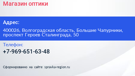 Магазин оптики по адресу 400026, Волгоградская область, Большие Чапурники, проспект Героев Сталинграда, 50 в дальнейшем Организация, размещена в следующих категориях: