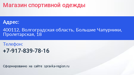 Магазин спортивной одежды по адресу 400112, Волгоградская область, Большие Чапурники, Пролетарская, 18 в дальнейшем Организация, размещена в следующих категориях: