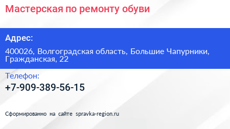 Мастерская по ремонту обуви по адресу 400026, Волгоградская область, Большие Чапурники, Гражданская, 22 в дальнейшем Организация, размещена в следующих категориях: