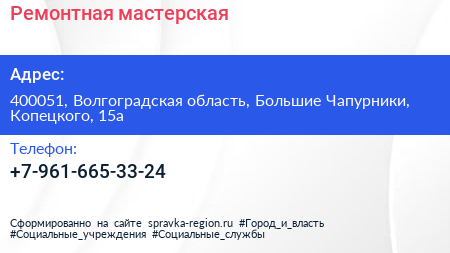 Ремонтная мастерская по адресу 400051, Волгоградская область, Большие Чапурники, Копецкого, 15а в дальнейшем Организация, размещена в следующих категориях: