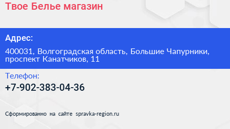 Твое Белье, магазин по адресу 400031, Волгоградская область, Большие Чапурники, проспект Канатчиков, 11 в дальнейшем Организация, размещена в следующих категориях: