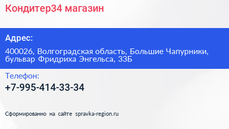 Кондитер34, магазин по адресу 400026, Волгоградская область, Большие Чапурники, бульвар Фридриха Энгельса, 33Б в дальнейшем Организация, размещена в следующих категориях: