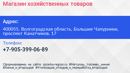 Магазин хозяйственных товаров по адресу 400055, Волгоградская область, Большие Чапурники, проспект Канатчиков, 17 в дальнейшем Организация, размещена в следующих категориях: