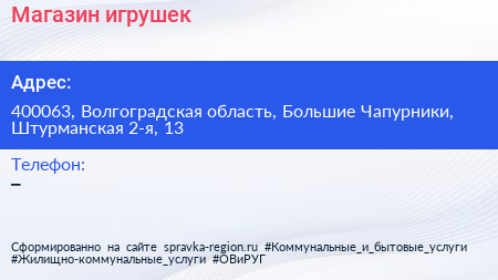 Магазин игрушек по адресу 400063, Волгоградская область, Большие Чапурники, Штурманская 2-я, 13 в дальнейшем Организация, размещена в следующих категориях: