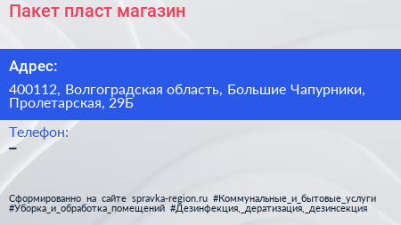 Пакет-пласт, магазин по адресу 400112, Волгоградская область, Большие Чапурники, Пролетарская, 29Б в дальнейшем Организация, размещена в следующих категориях: