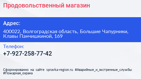 Продовольственный магазин по адресу 400022, Волгоградская область, Большие Чапурники, Клавы Панчишкиной, 169 в дальнейшем Организация, размещена в следующих категориях: