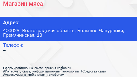 Магазин мяса по адресу 400029, Волгоградская область, Большие Чапурники, Гремячинская, 18 в дальнейшем Организация, размещена в следующих категориях: